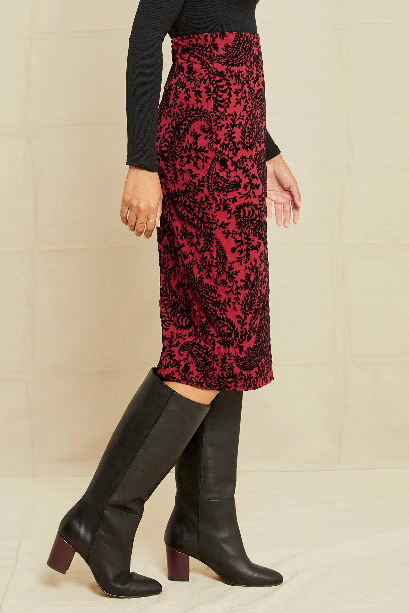 High-waisted pencil skirt with invisible side zipper. Pair with our Aliza Top or your favorite fitted top and boots. Made from a blend of upcycled fabrics to stay true to our commitment to repurpose and give new life to leftover materials.