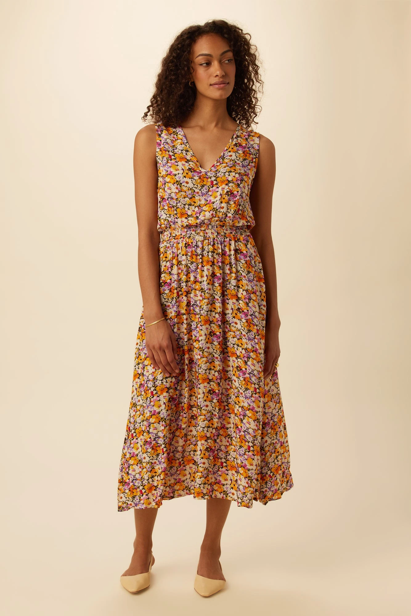 Classic v-neck midi dress with a-line skirt and smocked waist band. This pull on dress has adjustability at waist to ensure a comfortable fit. Made from sustainable ECOVEROâ„¢ Viscose fabric.