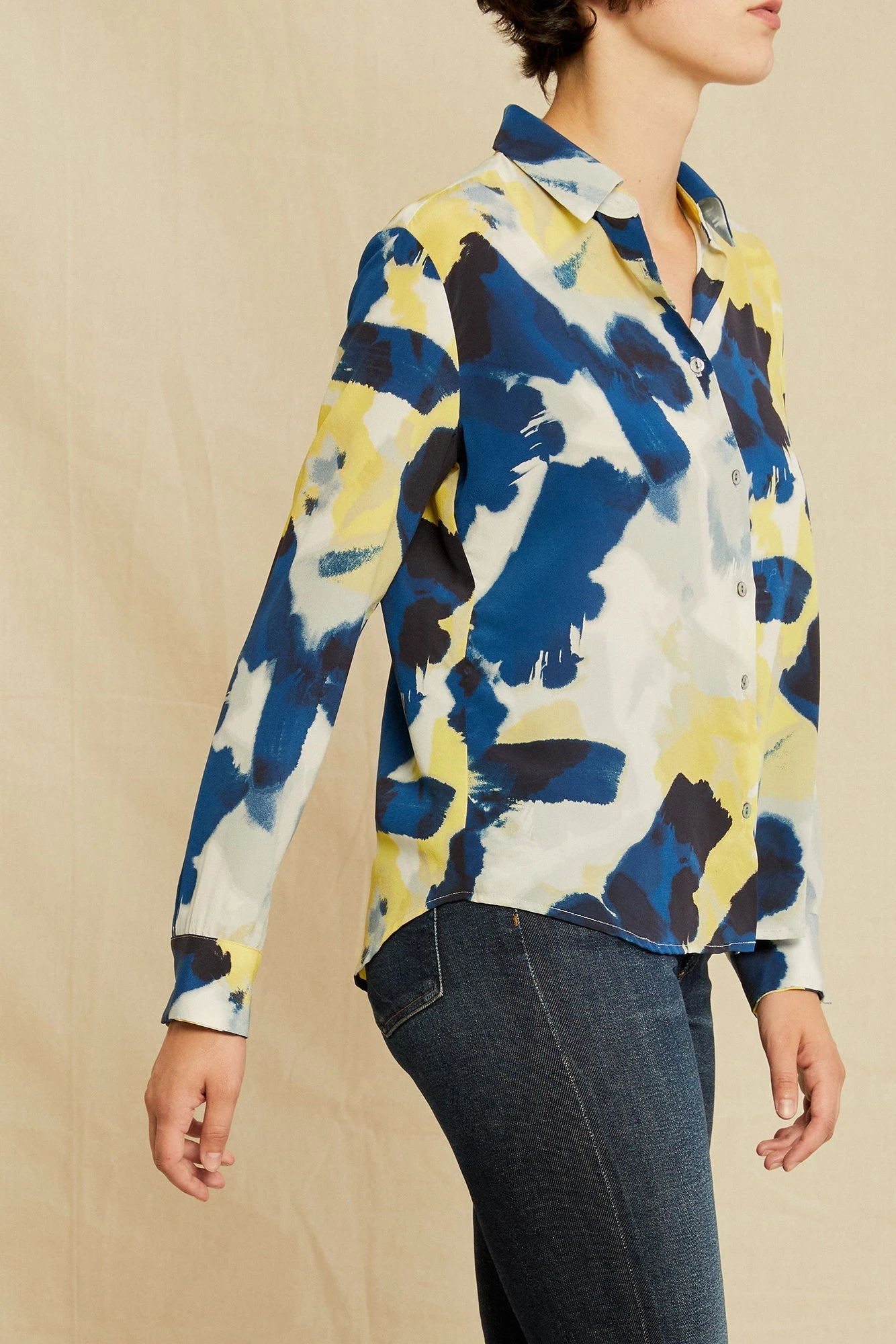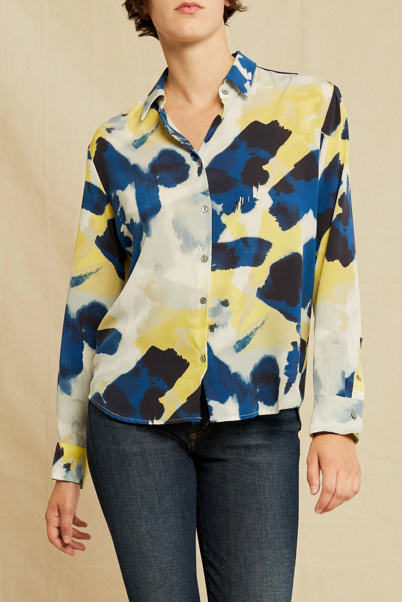 Long sleeve button-down blouse with a collar and easy, relaxed fit. Made in our finest silk, this is the perfect staple to have year-round.