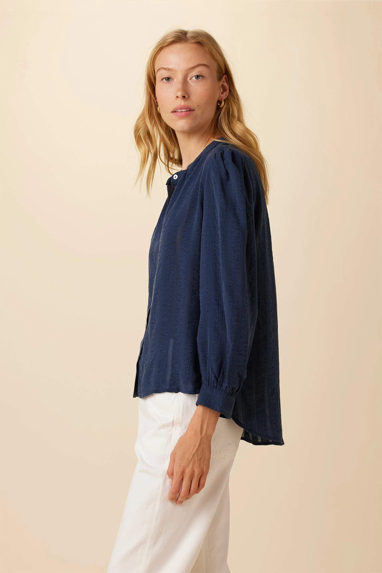 Long sleeve, relaxed fit blouse with functional front button, made from TENCELâ„¢, a fabric derived from eucalyptus trees that is softer than silk and cooler than linen. We suggest pairing with your favorite mid or high-rise bottoms.