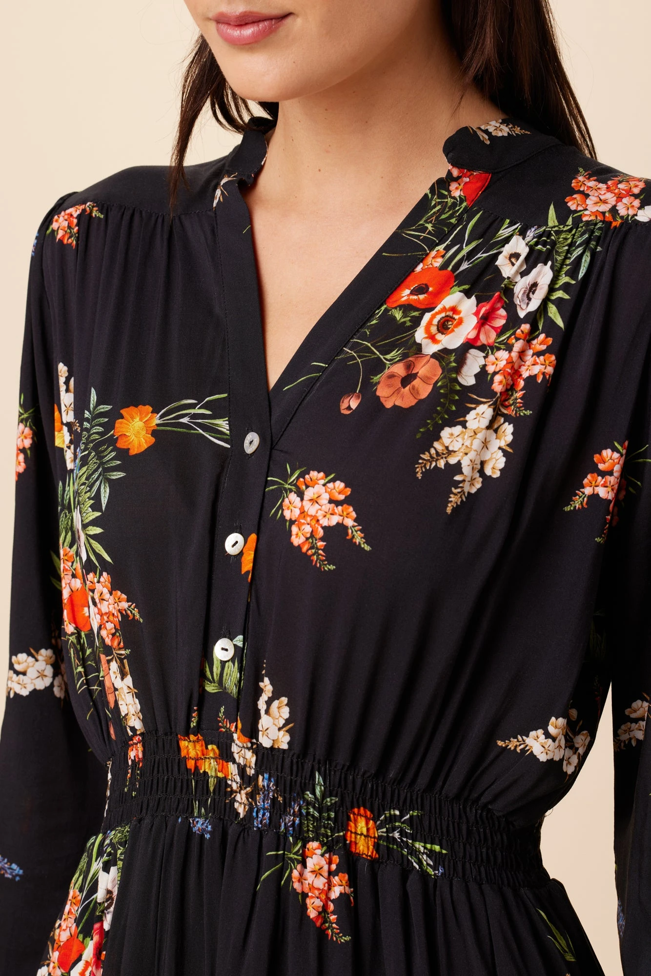 A long sleeve shirt dress, smocked waist and cuff detail with flounce skirt and an a-line button detail on front placket down to waist, made in our sustainable ECOVEROâ„¢ Viscose fabric.