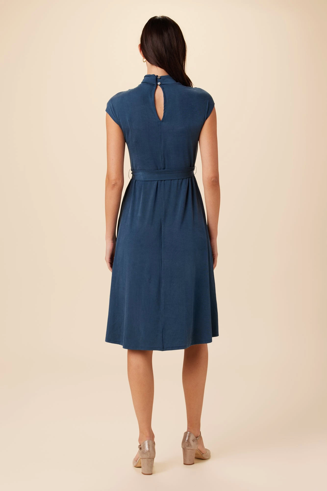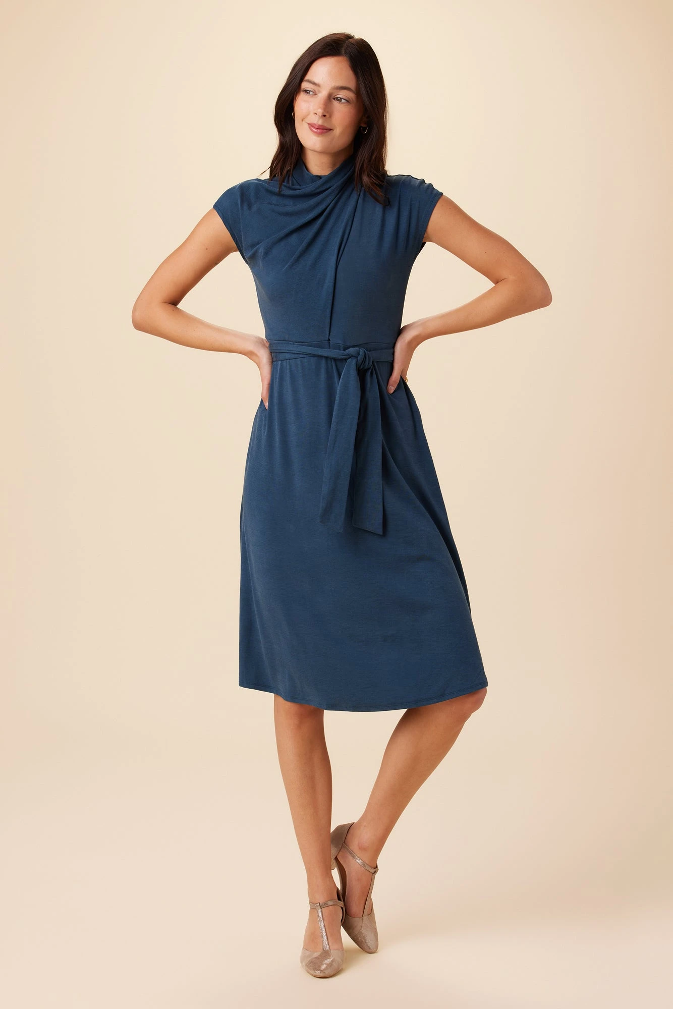 Slim fit dress featuring an a-line skirt and draping at front of bodice, with an elastic waist and detachable belt for comfortability.
