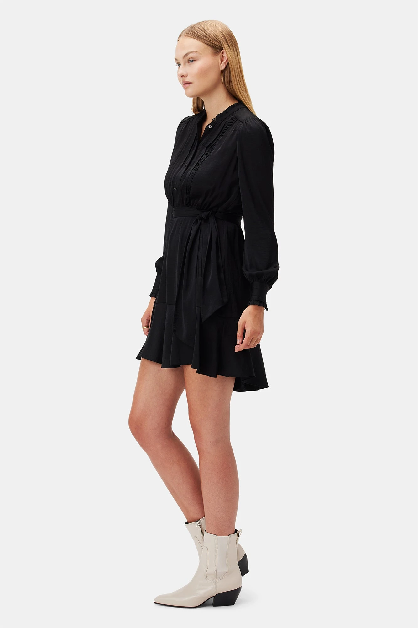 - This chic dress featuresĀ long sleeves, a-line skirt that is lined, button front placket, inseam pockets and anĀ detachableĀ waist tie.