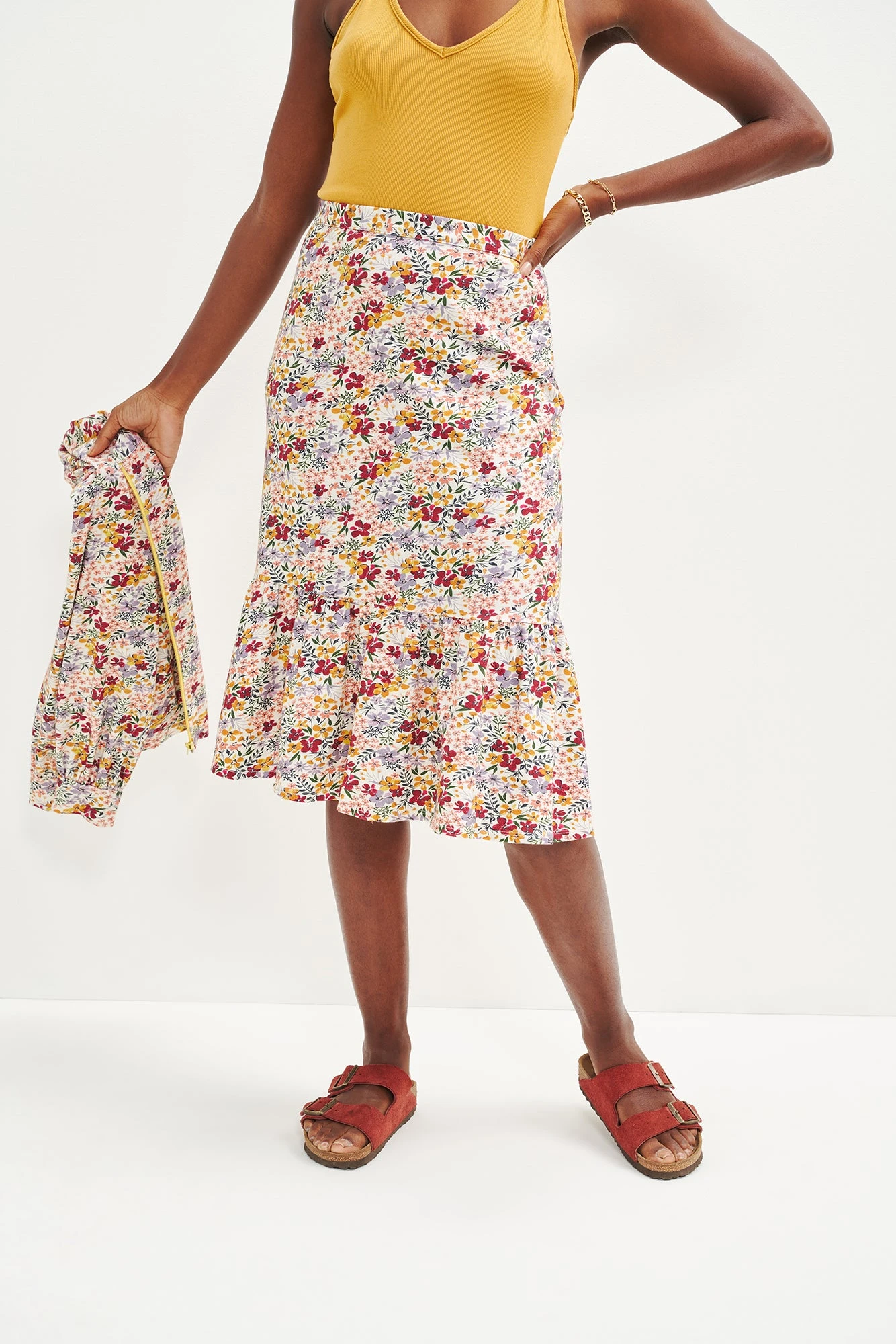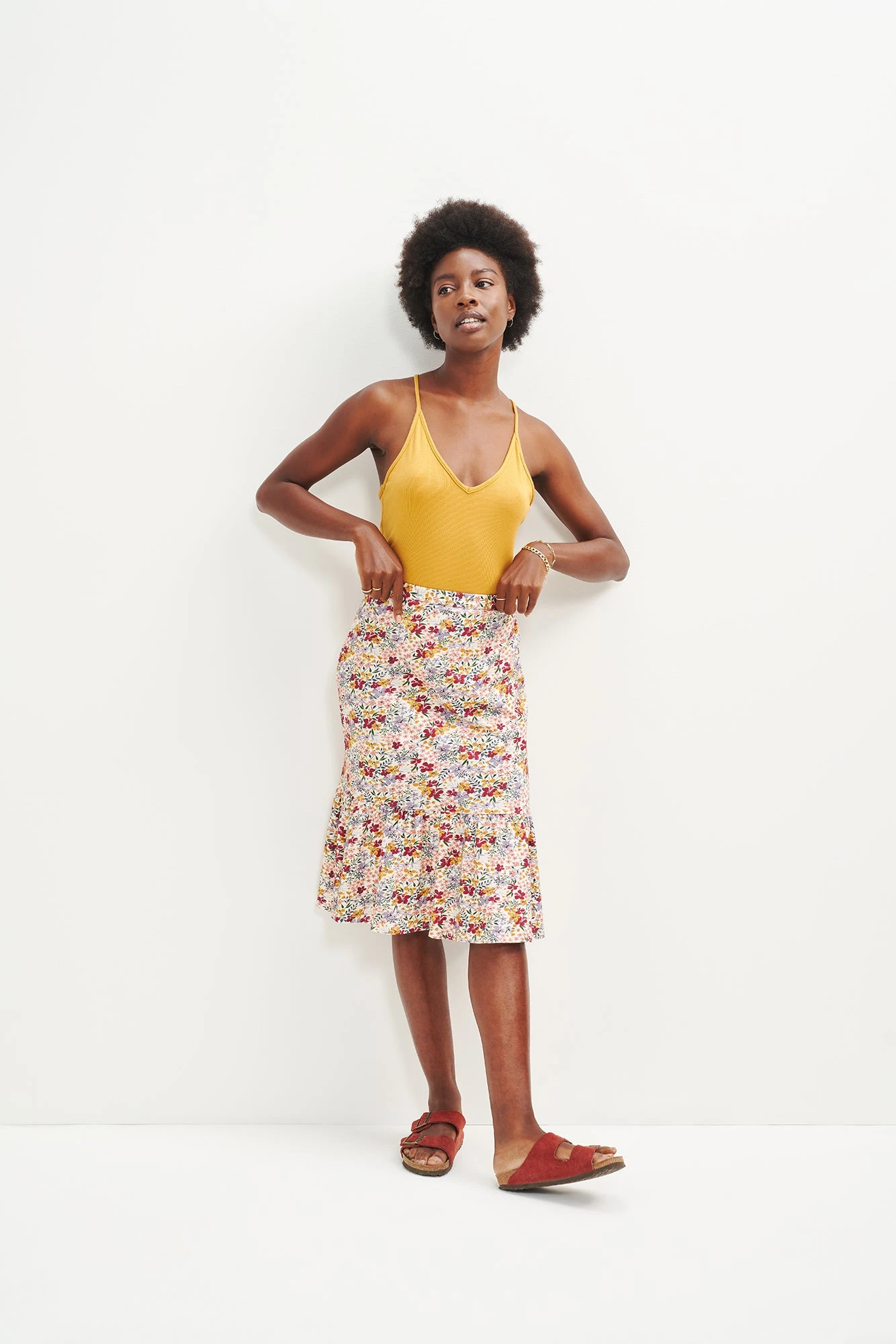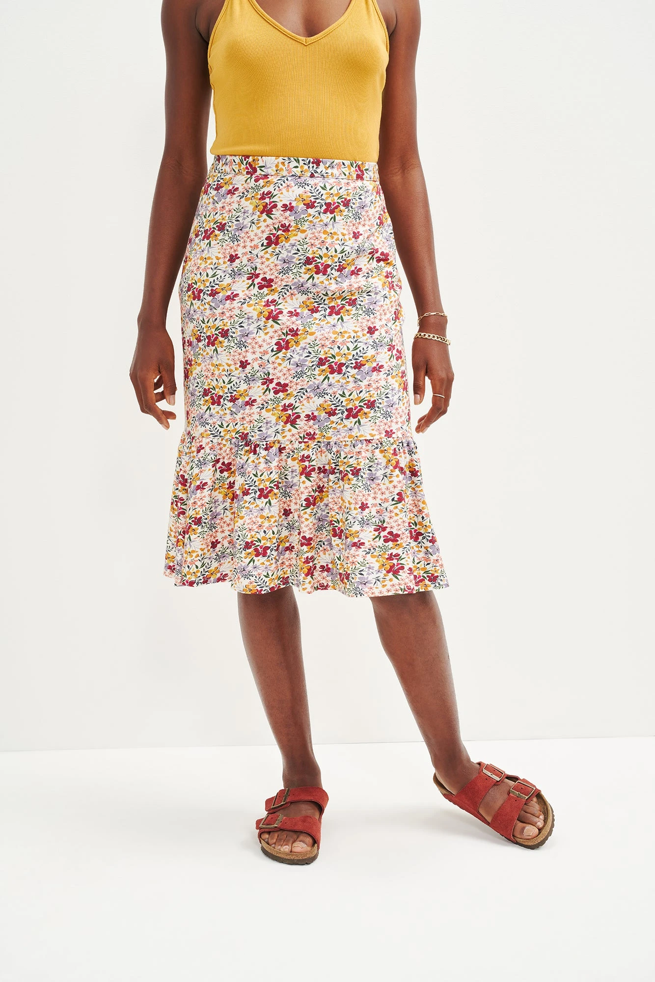 Midi skirt with a straight silhouette that falls below the knees, with a dramatic ruffle detail added for a sophisticated twist. Made in our Reverie Knit fabric, a super soft and breathable blend of Organic Cotton and Modal.