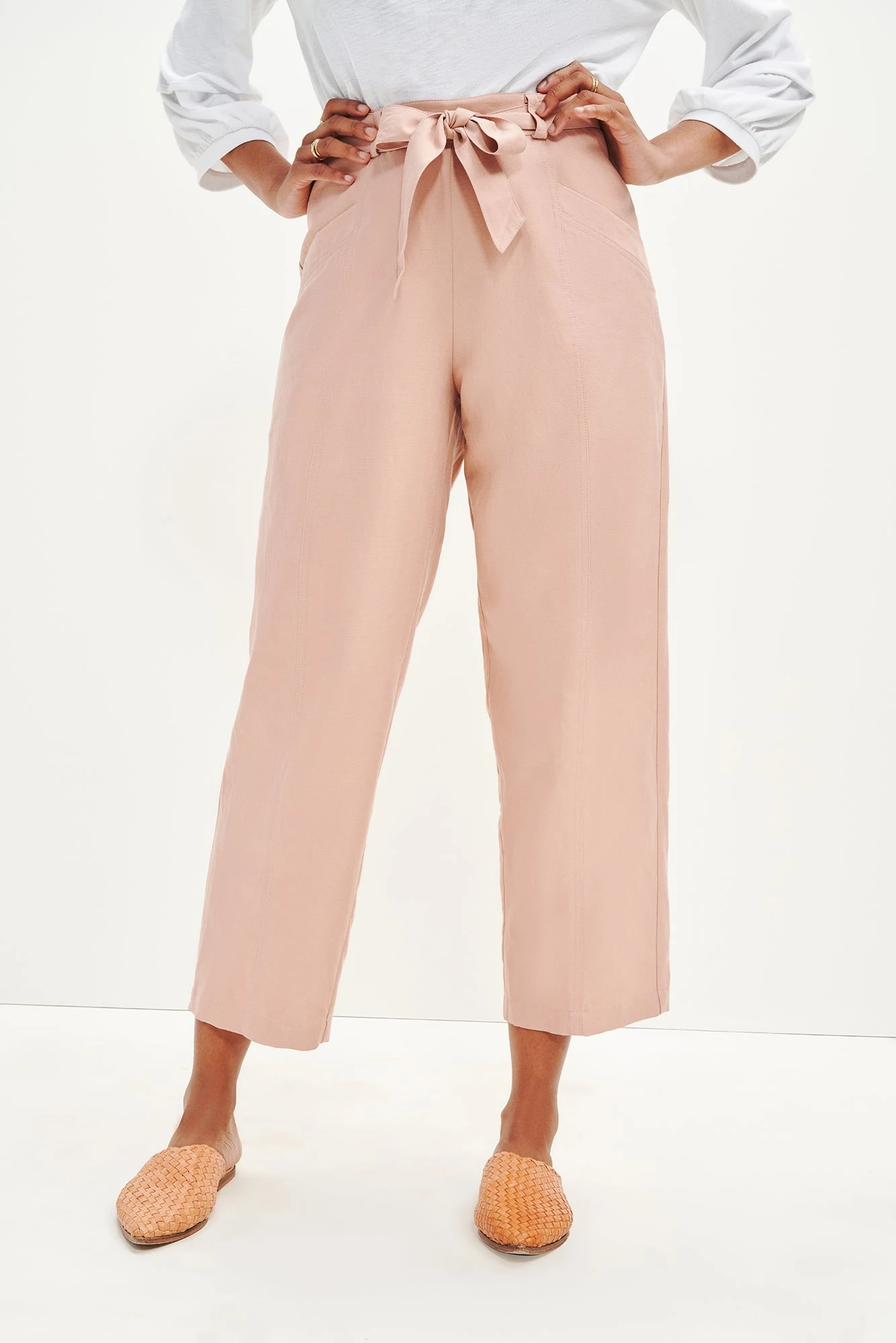 Strength meets feminine detailing in these easy utility pants. Featuring a high waist fit with a side zipper, side pockets, a fixed waist tie, and a straight-leg silhouette that hits at the ankle. Made in our Femme Fête fabric, a luxe blend of Tencel, Organic Cotton, and Linen.Â