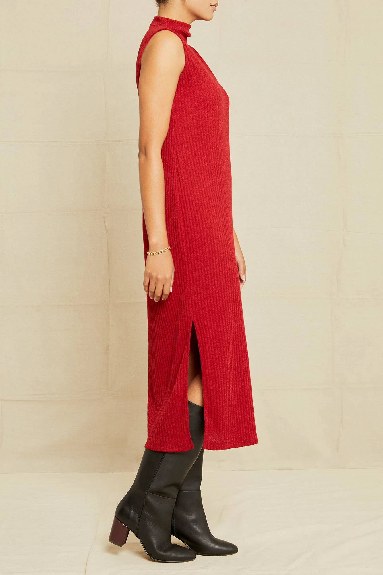 Mock neck, sleeveless relaxed fit midi dress with side slits. Made in our coziest fleece, a blend of modal and organic cotton.