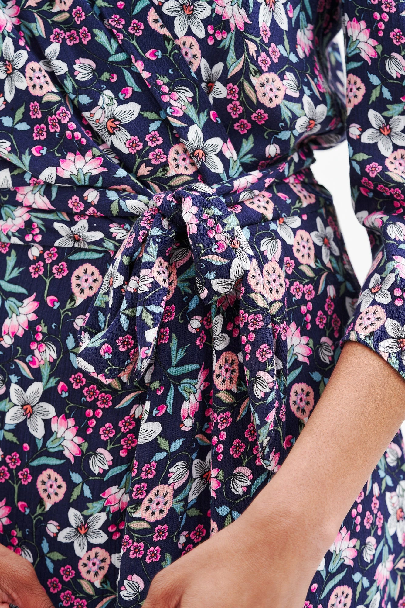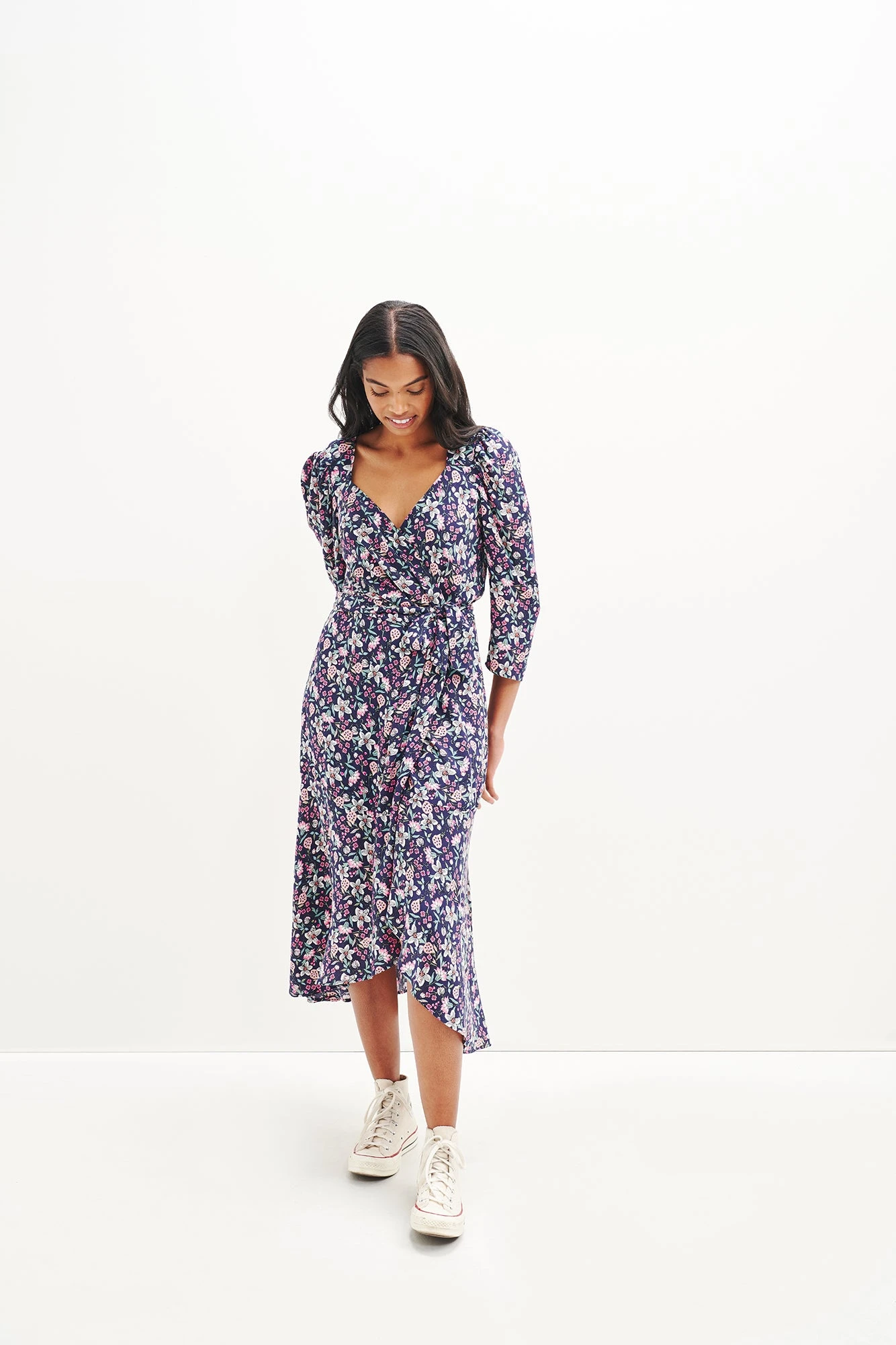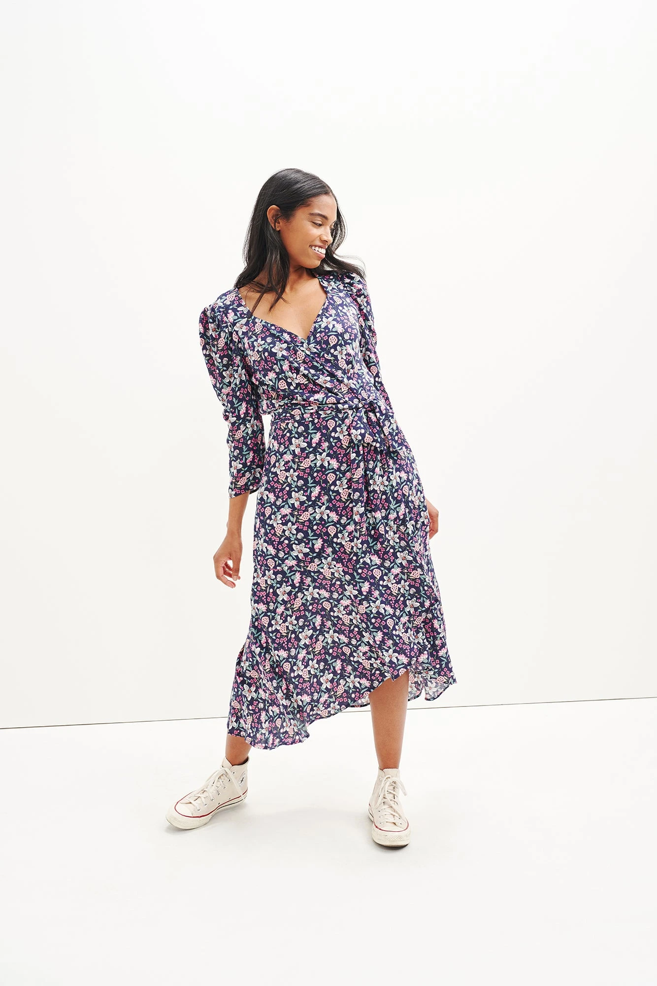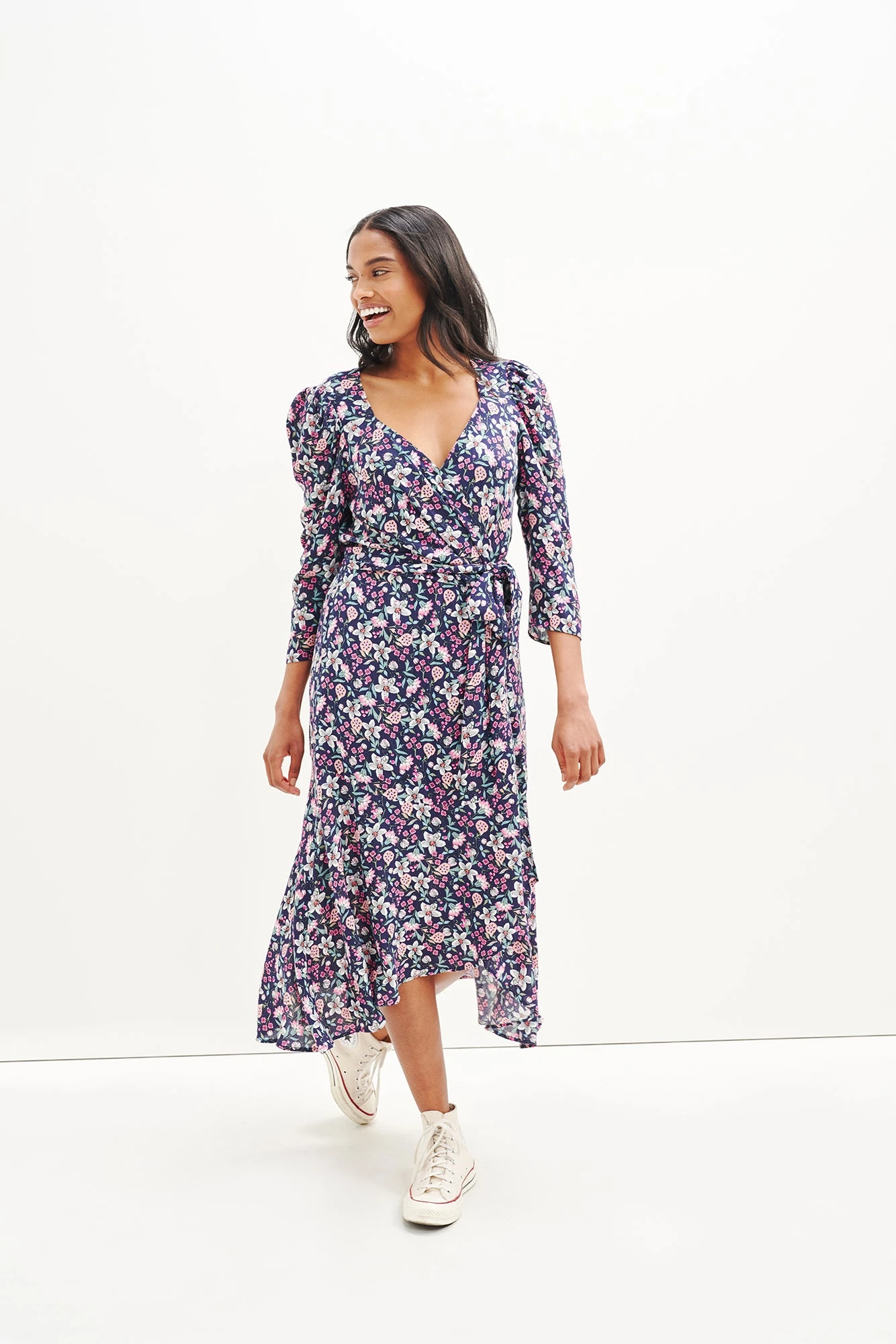 Midi length wrap dress with an adjustable waist tie and volume at the shoulders. Made from upcycled rayon as part of our commitment to repurpose old materials and reduce waste.