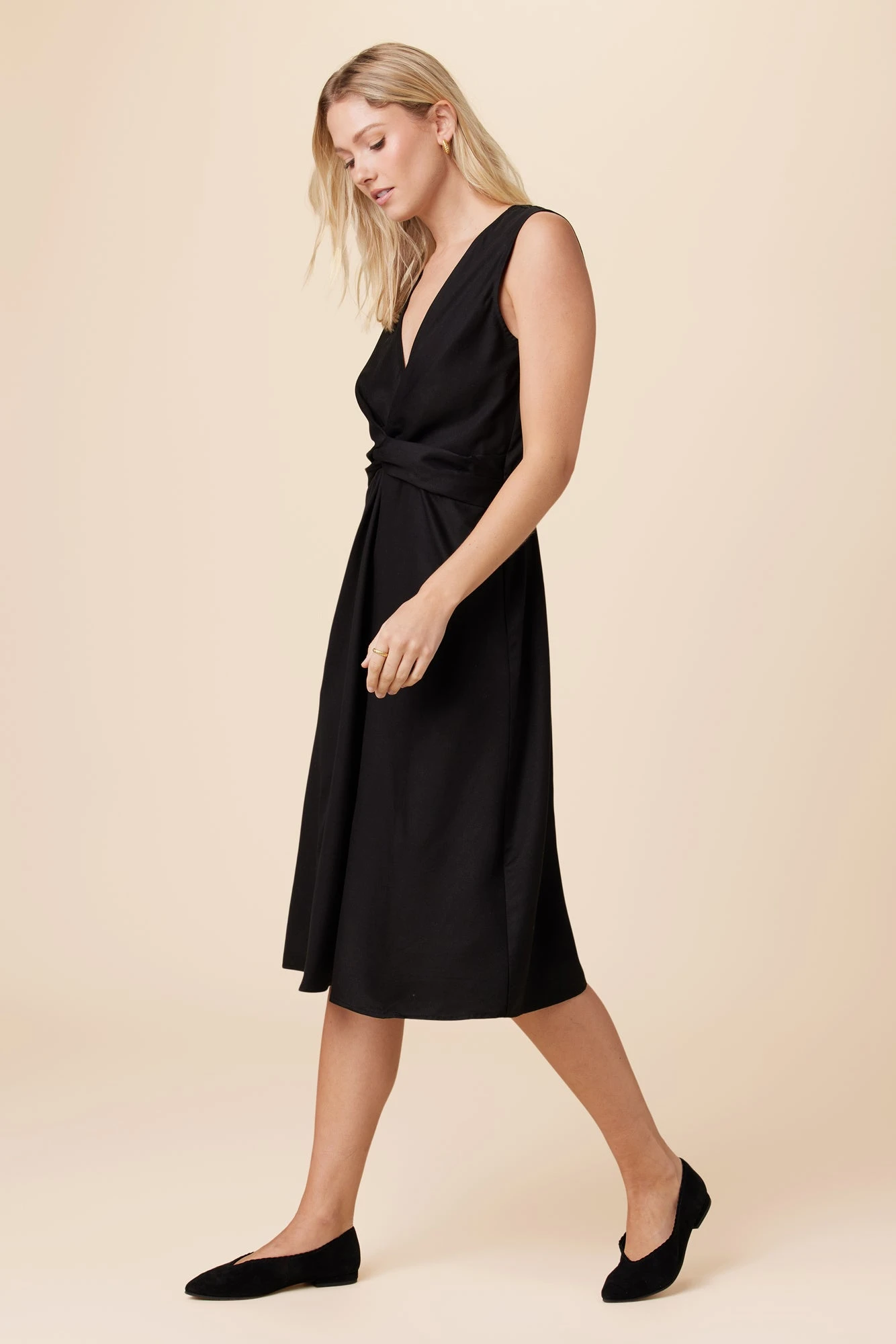 - V-neck midi dress featuring side pockets and twist front detailing at the waist.