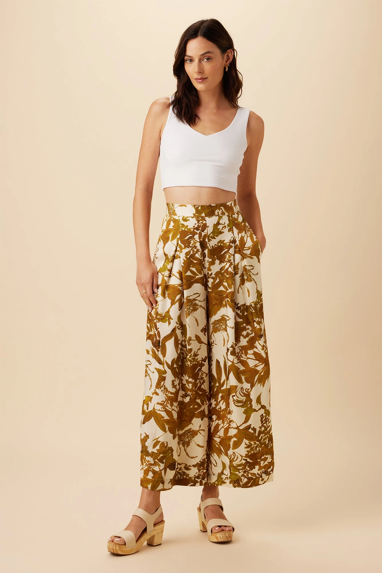 - Wide leg pant features a fitted waistband, invisible zipper at the side seam, pleat details on the front and side seam pockets.