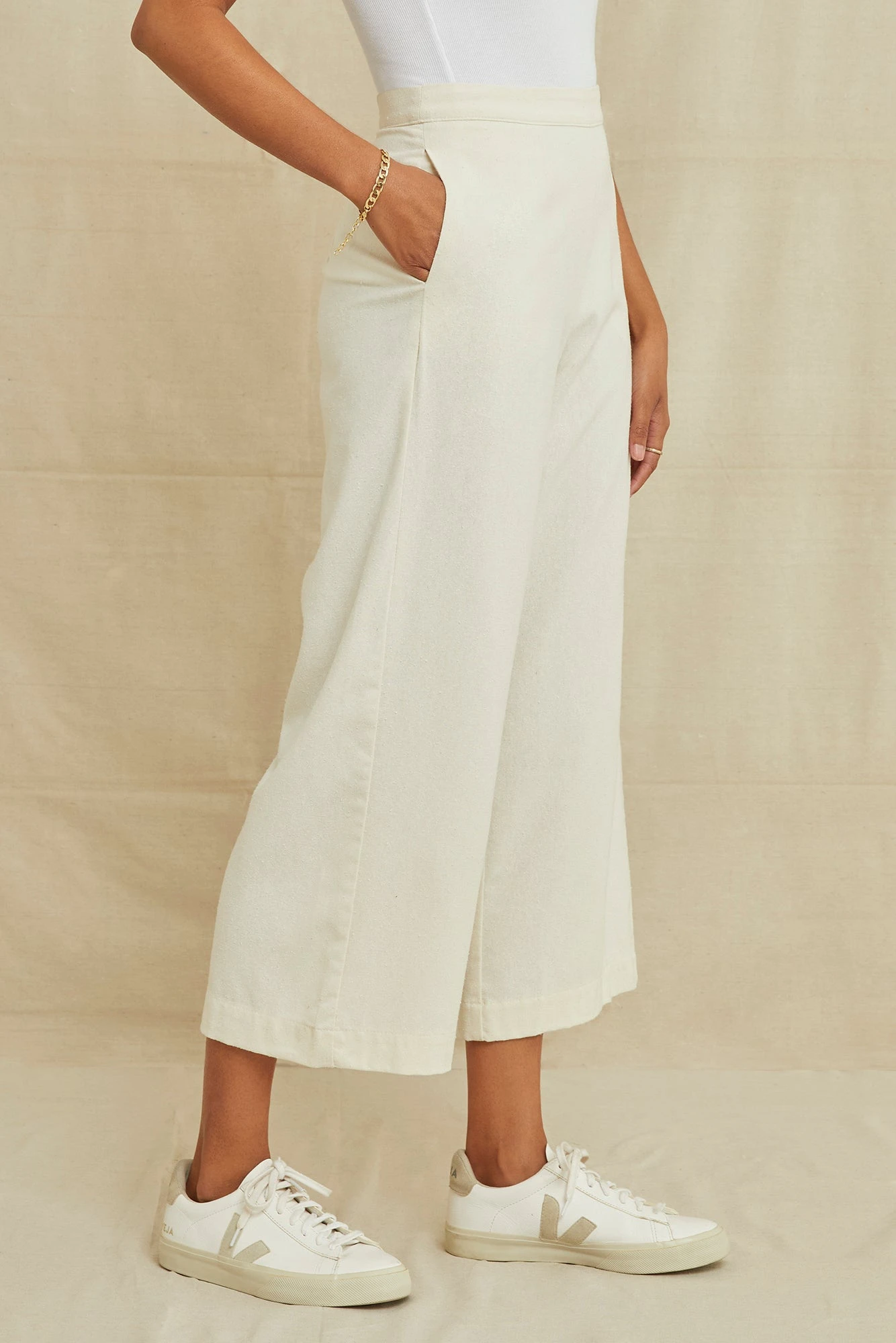 Wide leg, cropped trouser pant with size zipper, pockets and fixed waist. Made from soft and textured silk noil, a zero-waste fabric made from leftover filaments. We suggest pairing with our matching Sage Blazer and your favorite layering tank or striped top for a complete look.