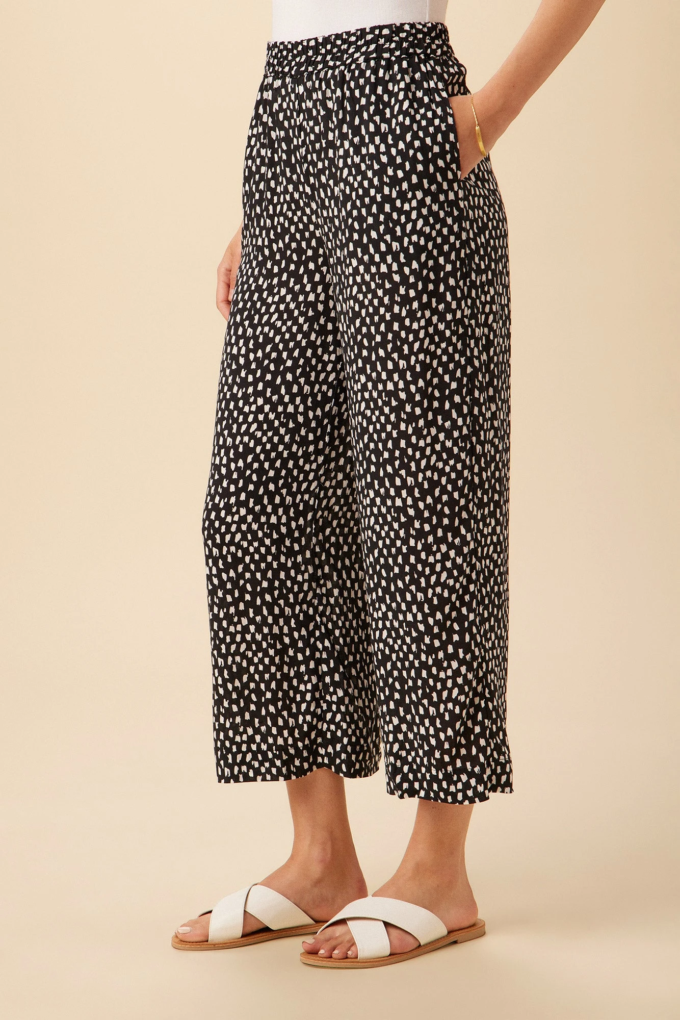 High waisted cropped pants with a straight leg, elastic waist, and side seam pockets. Cut in an easy and flattering silhouette, these pants are great for every day wear.