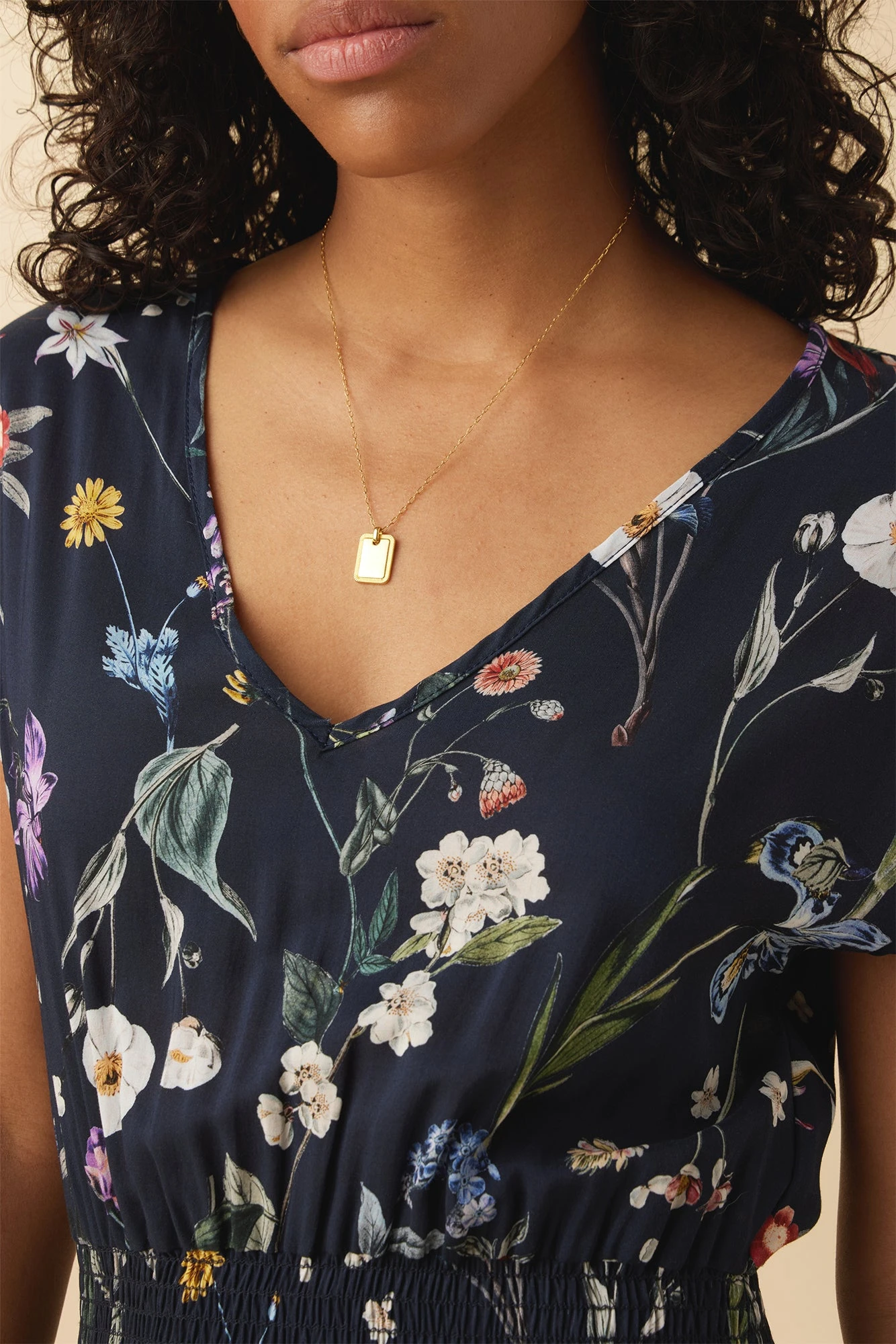 - Casual floral maxi dress featuring smocked detail at the waist, long midi length, dropped shoulder, v-neckline.Â