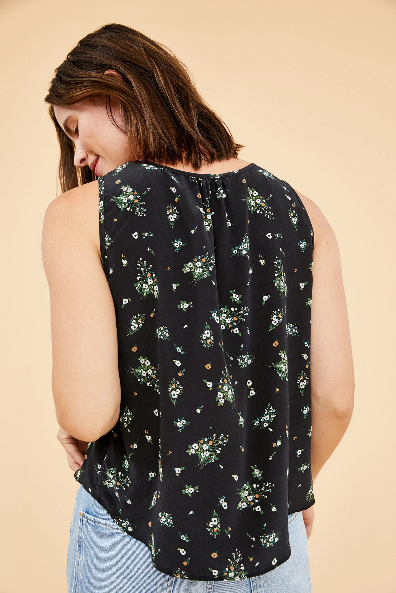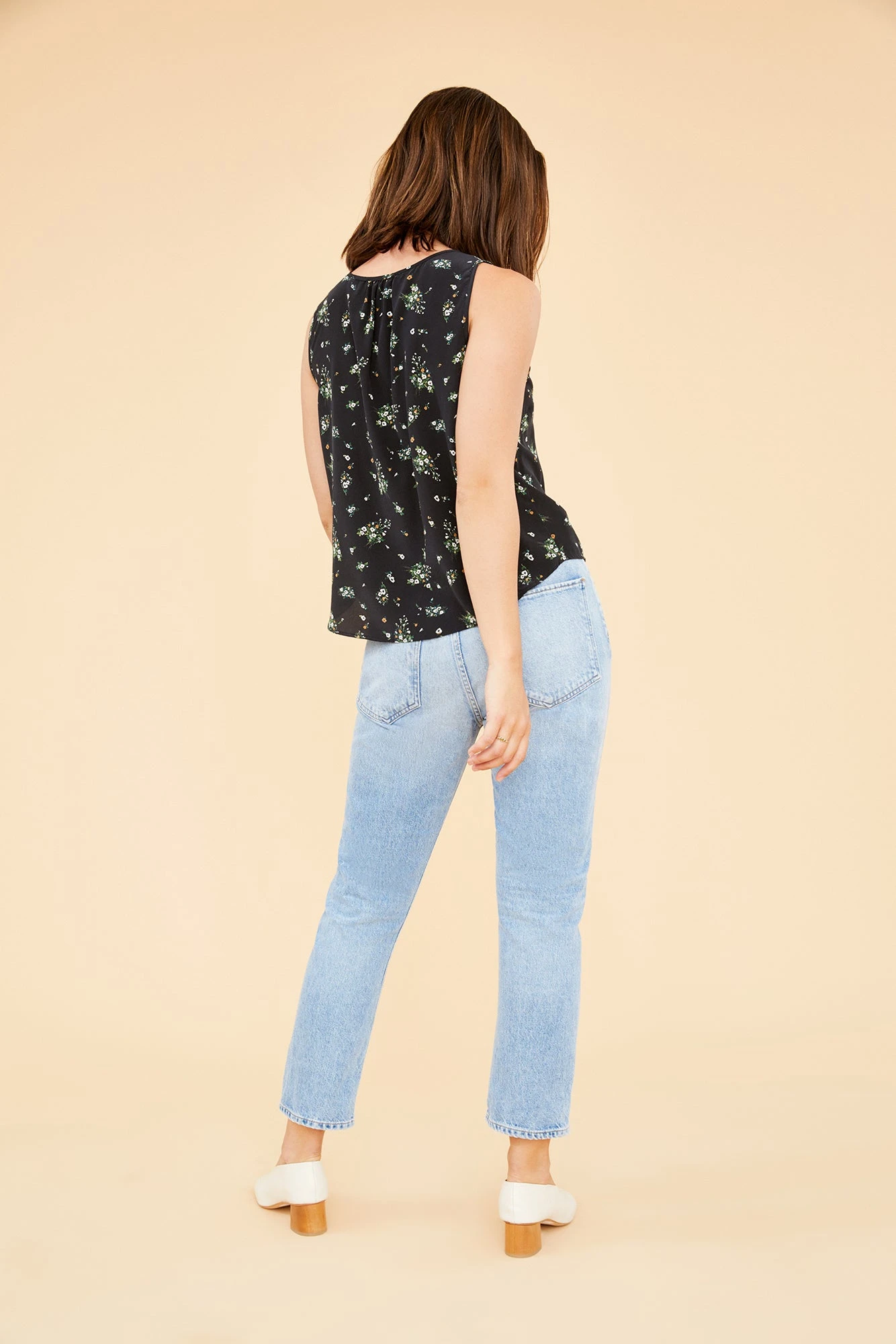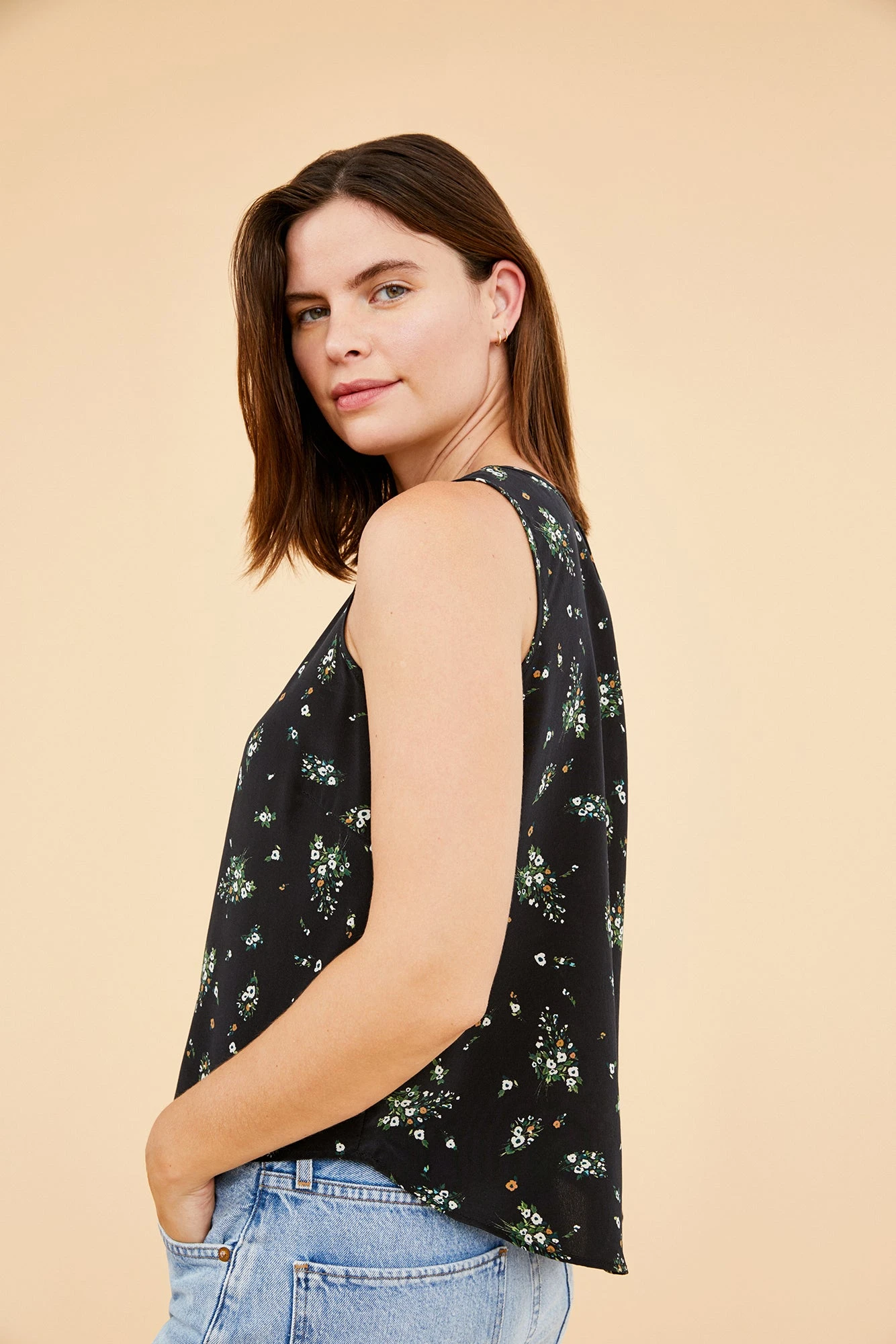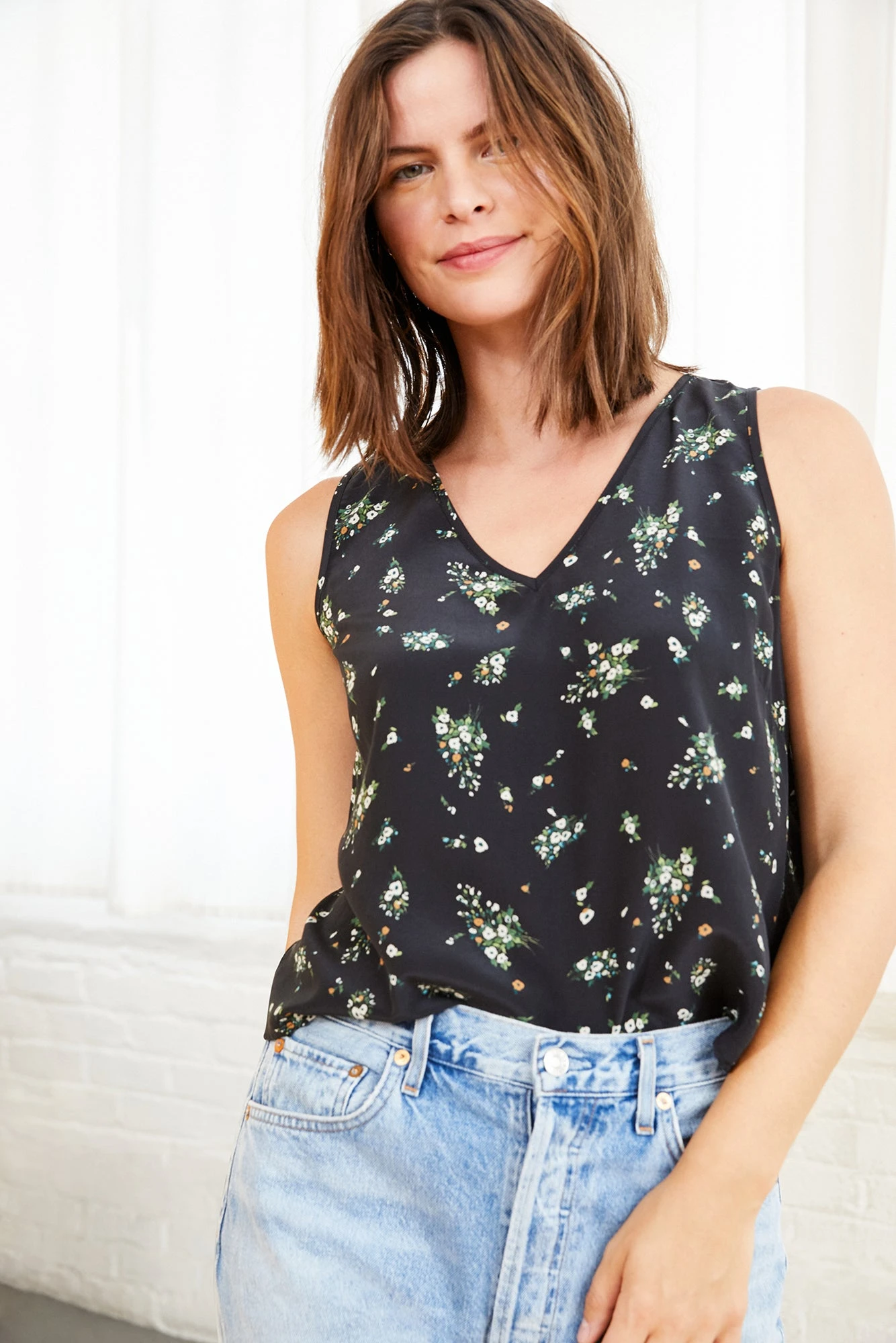 Sleeveless v-neck tank with a relaxed silhouette and slight shirttail hem. This elevated silk basic perfectly blends comfort and sophistication.
