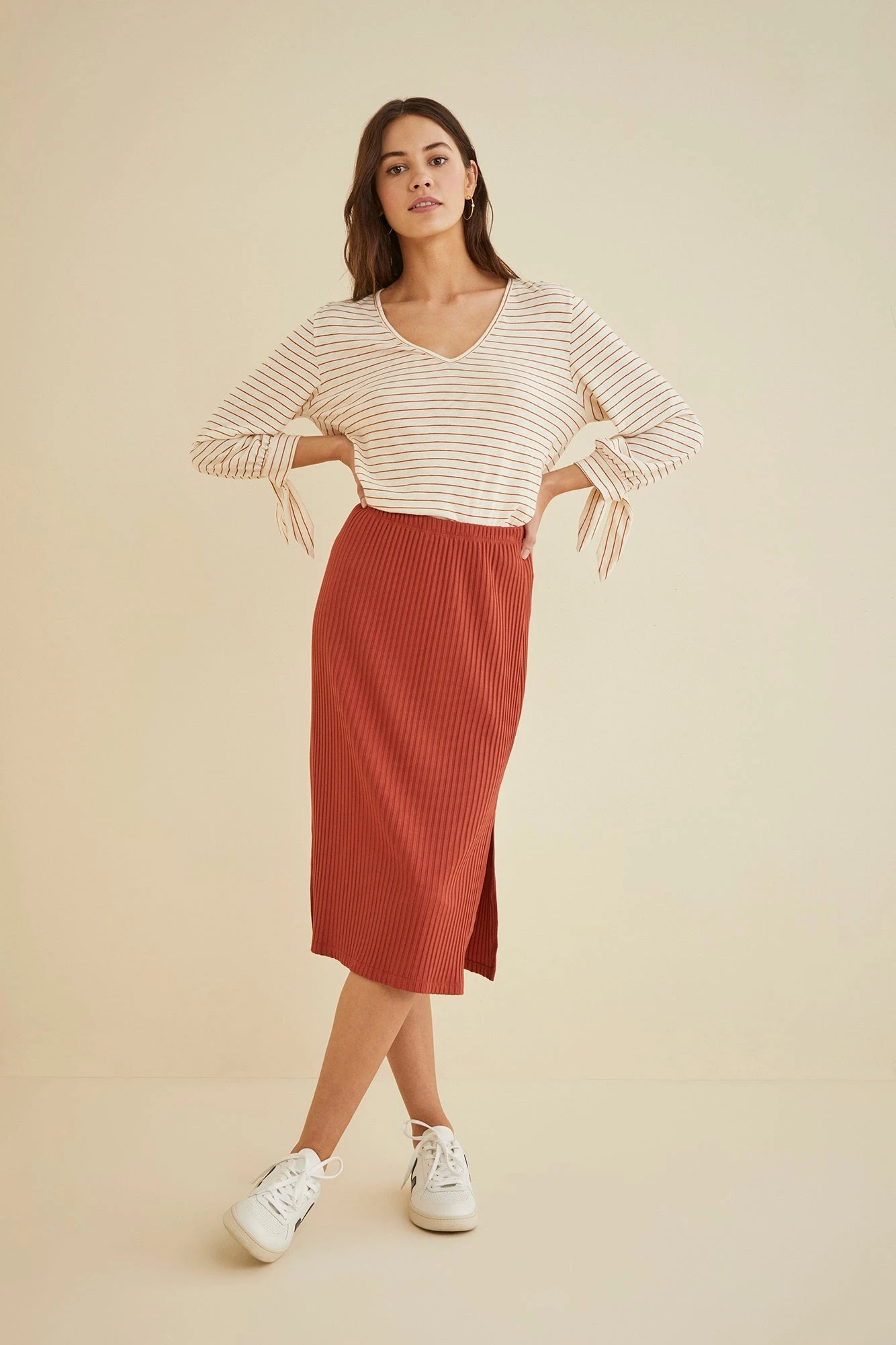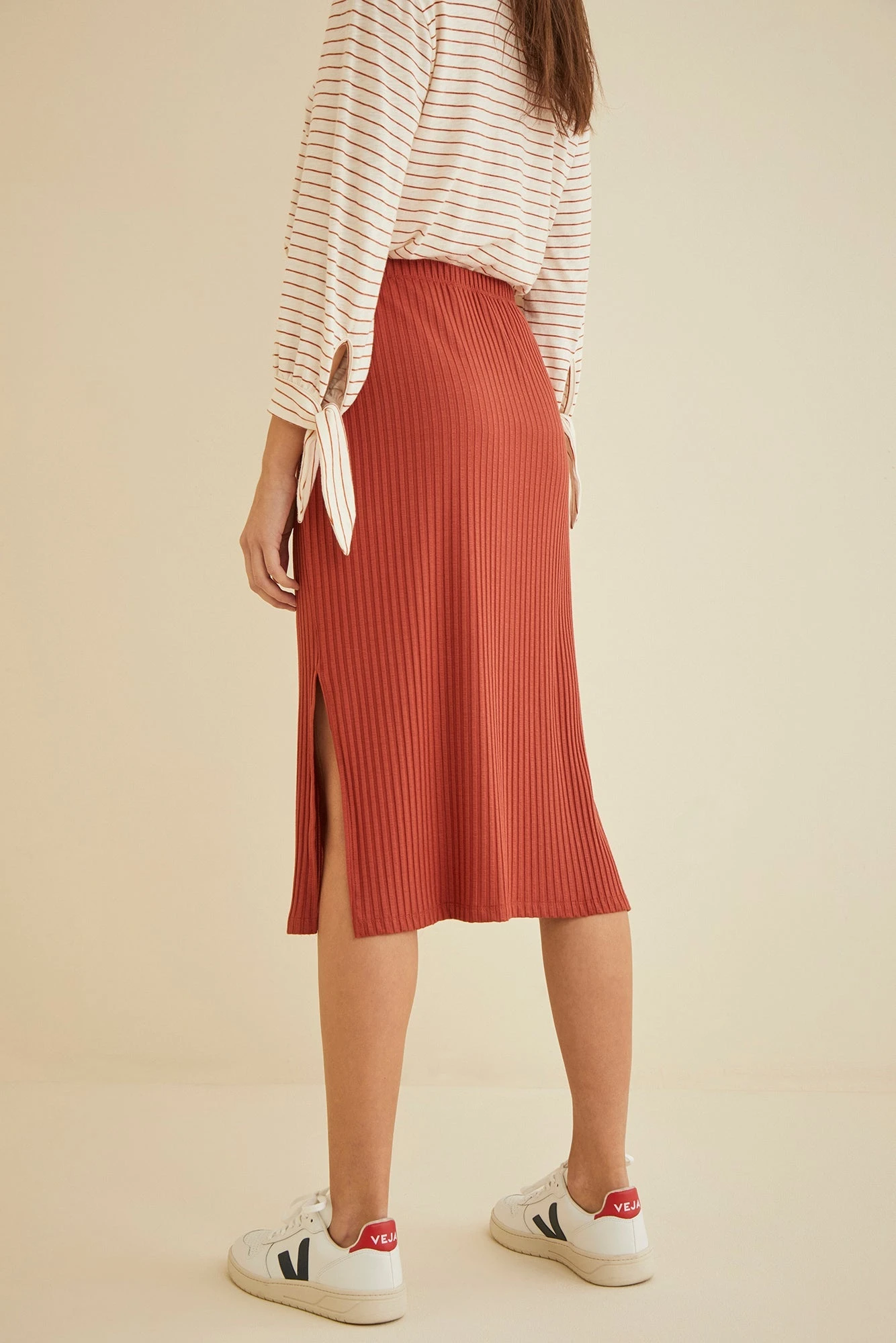 Ribbed skirt with a straight silhouette and side slits that falls below the knee. Made in our signature Paris Rib with the perfect amount of stretch and structure.